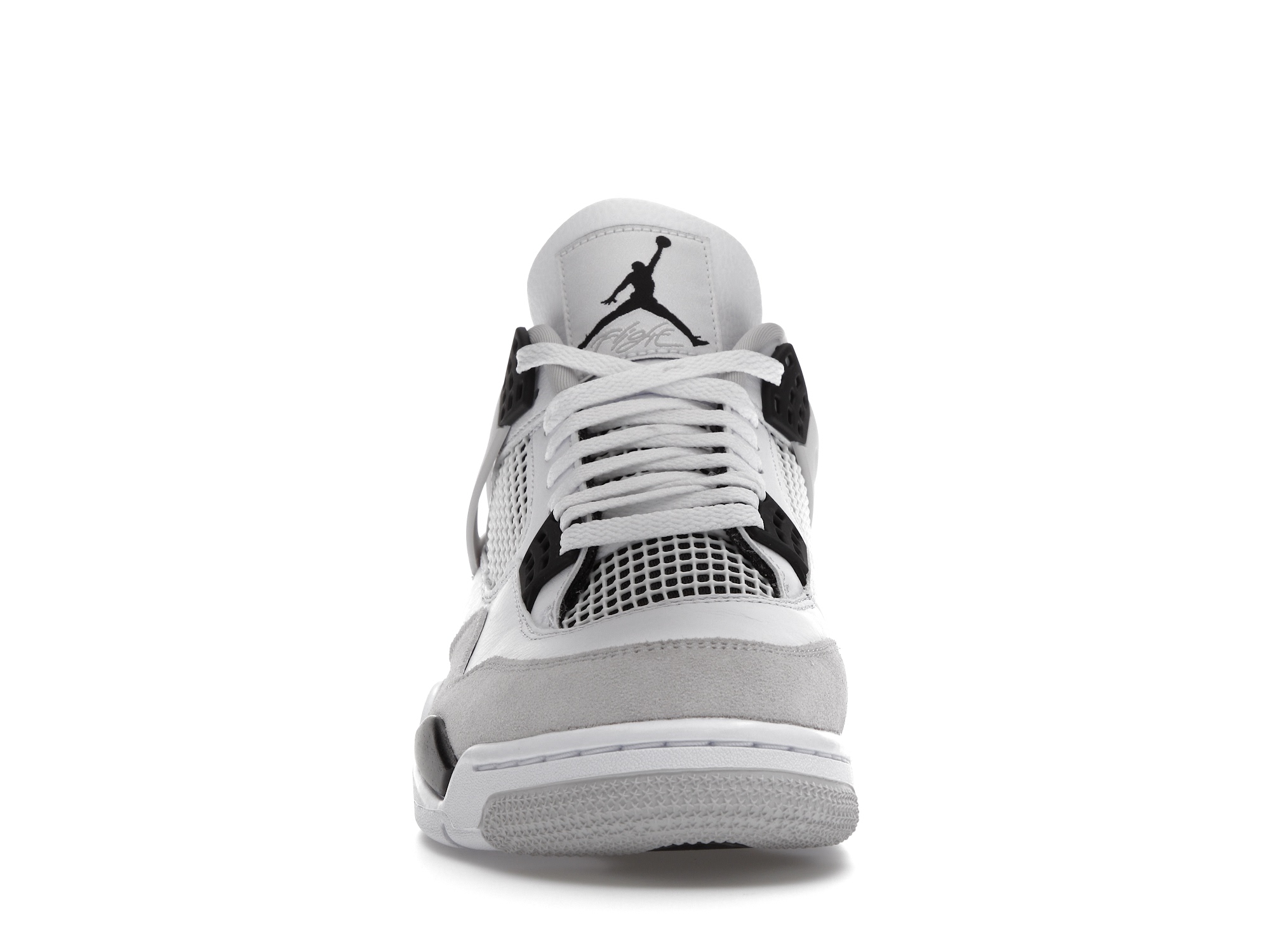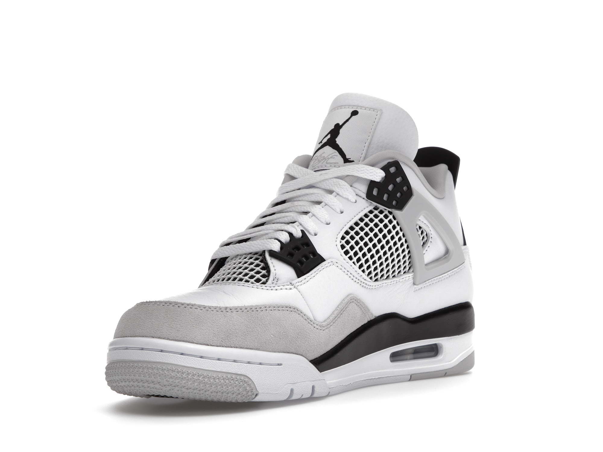 Pulling its color-blocked style from the Air Jordan 4 Military Blue, the Air Jordan 4 Military Black features a smooth white leather upper with a light grey Durabuck toe wrap and netted TPU inserts. Military Black eyelets, heel tabs, and underlays add a stark contrast to the upper. At the base, a white, black, and light grey sole with a visible Air unit completes the design.