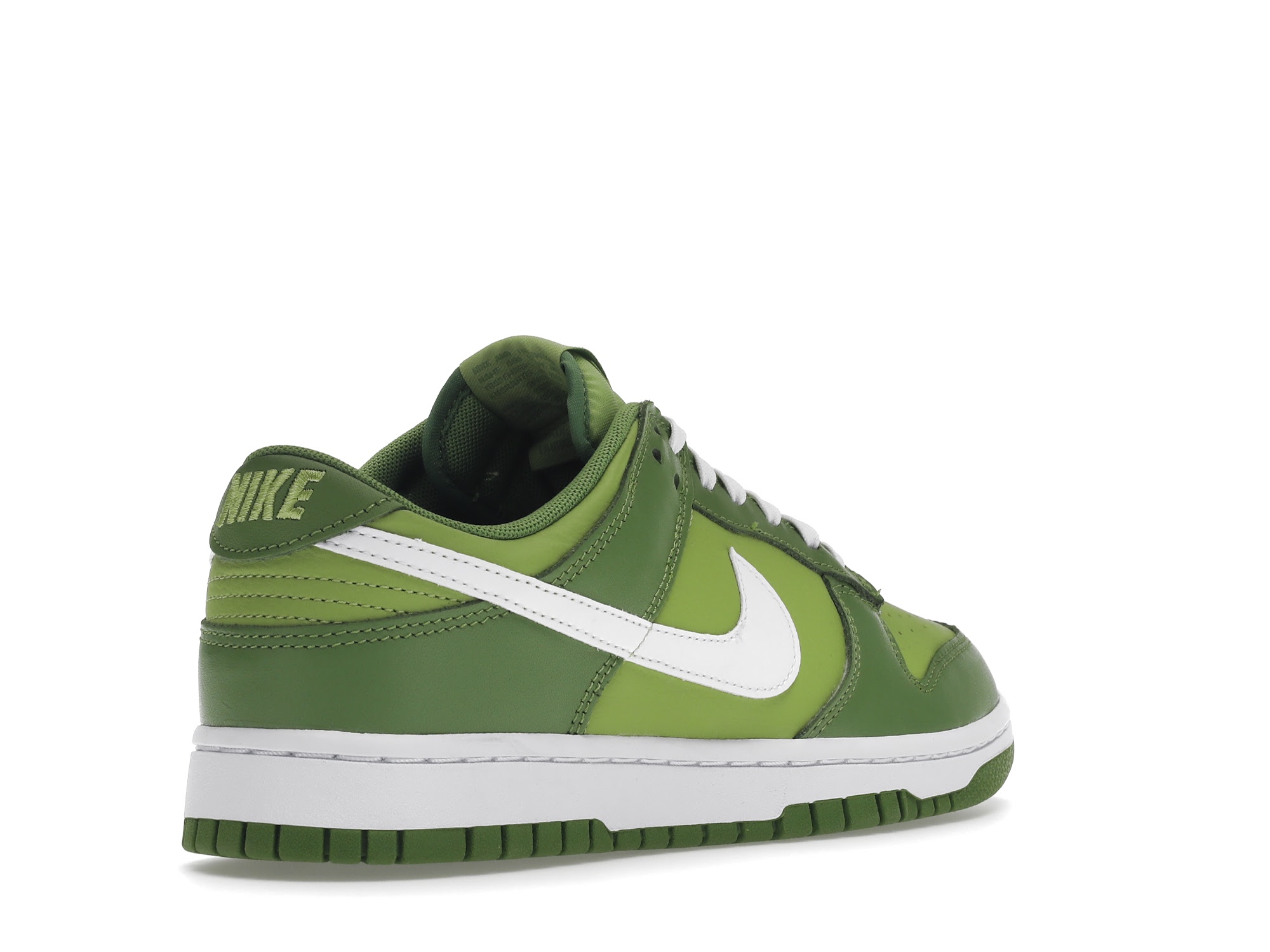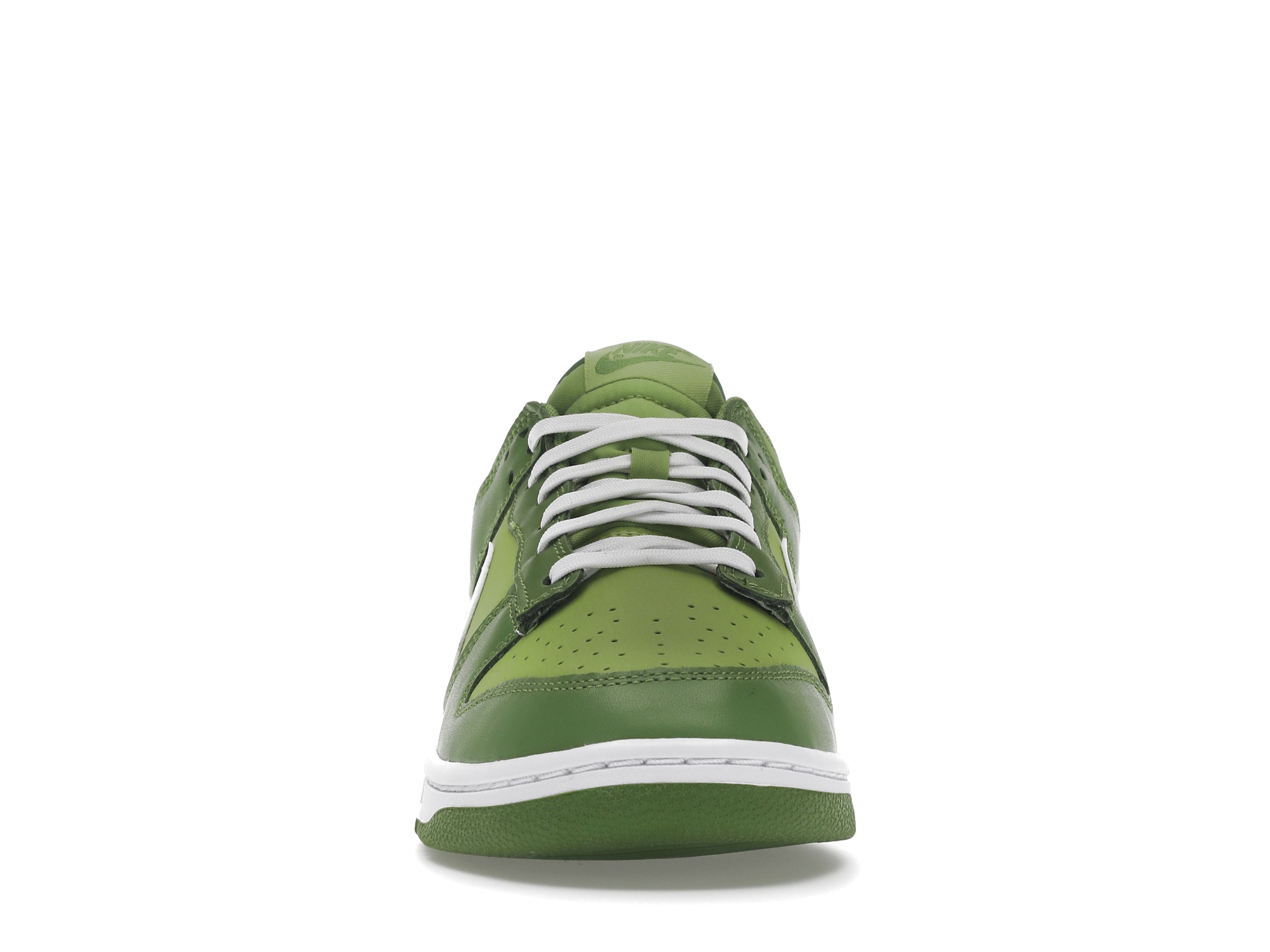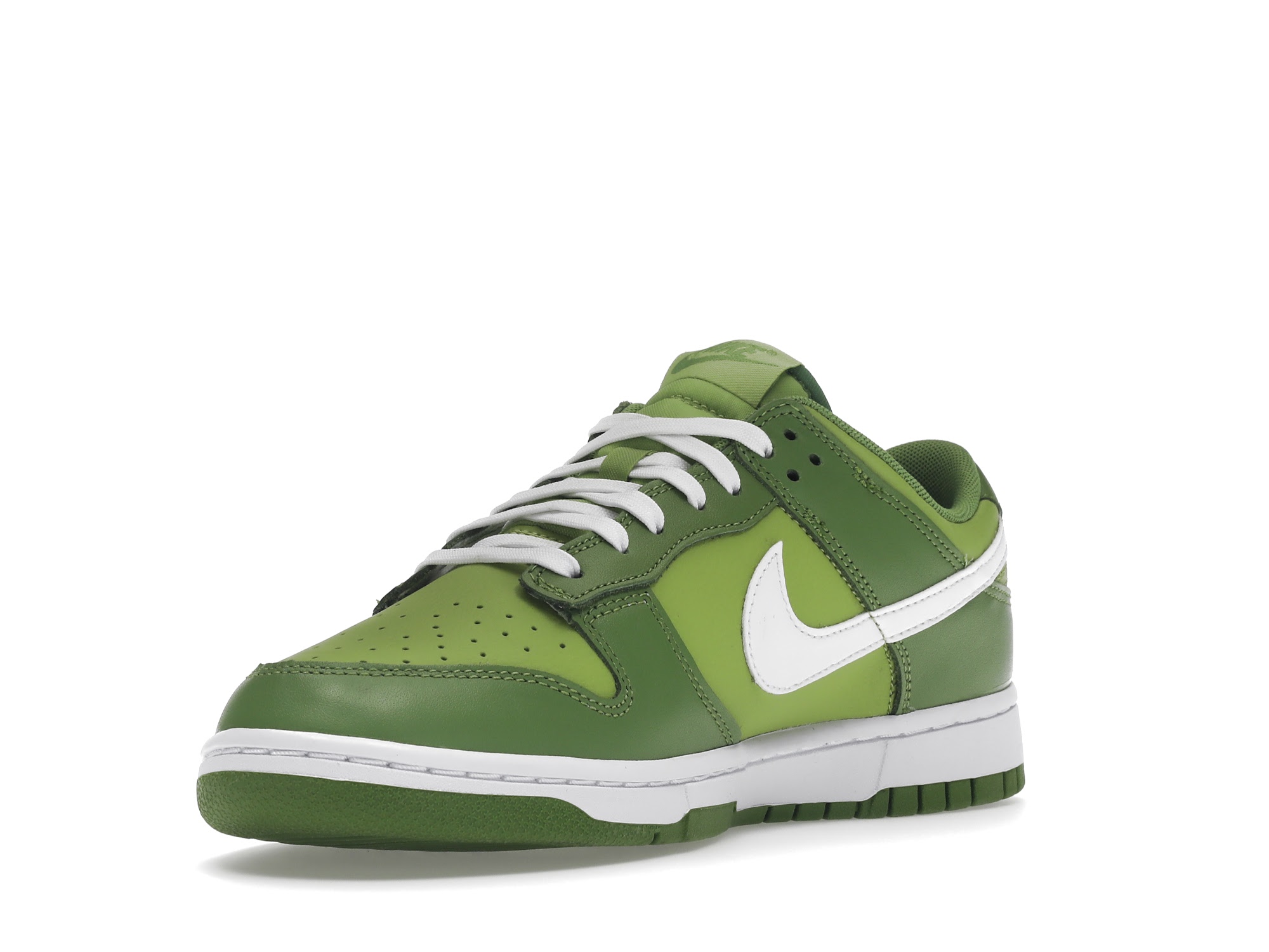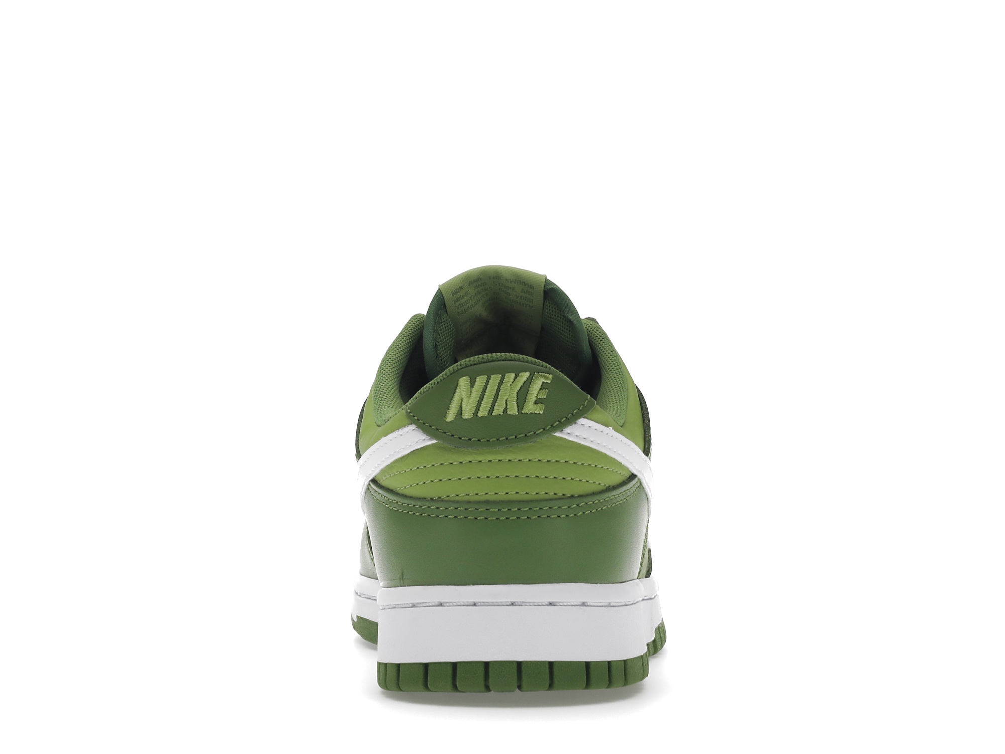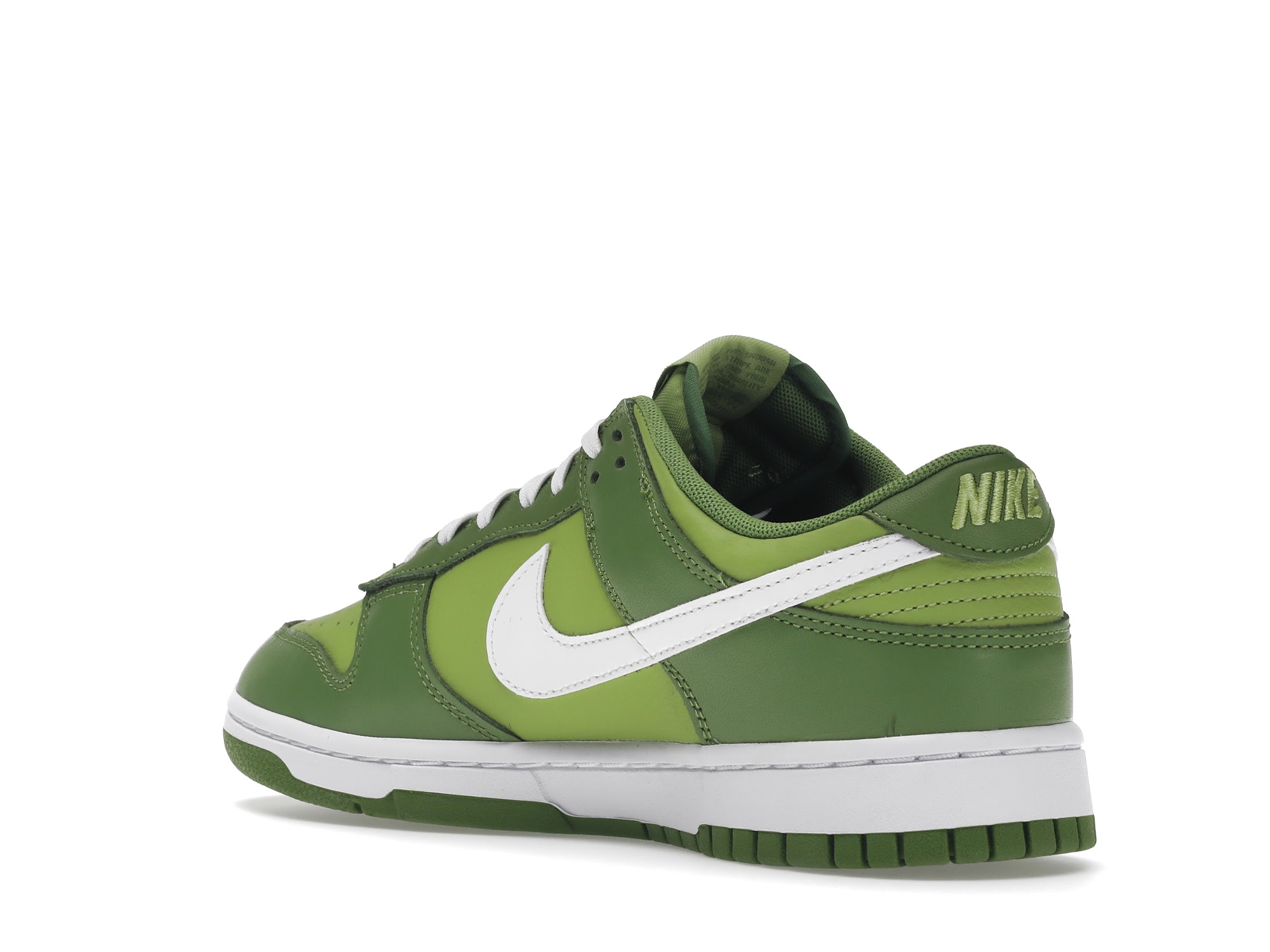 The Nike Dunk Low Chlorophyll features a light green smooth leather upper with darker green overlays and white Swooshes. Woven tongue labels and Nike embroideries on the heel tabs add a retro look. At the base, a white and green foam sole completes the design.