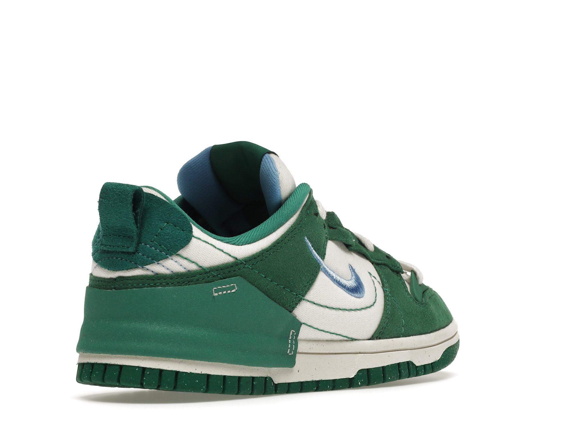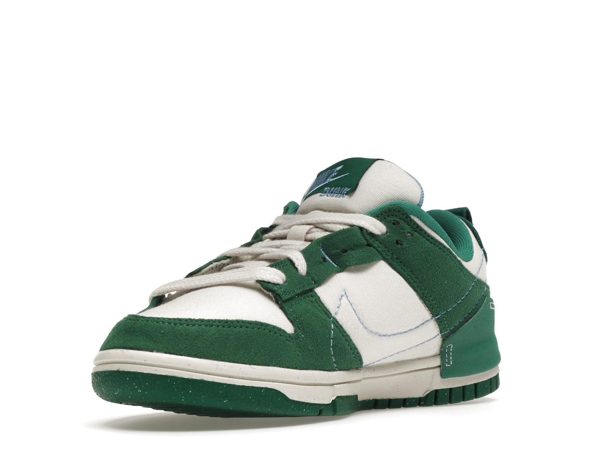 The women’s Nike Dunk Low Disrupt 2 Phantom University Blue (W) features a white woven upper with dark green suede overlays and a University Blue Swoosh embroidery. From there, an overlapping green leather heel wrap and reconstructed woven tongue label complete the design.
