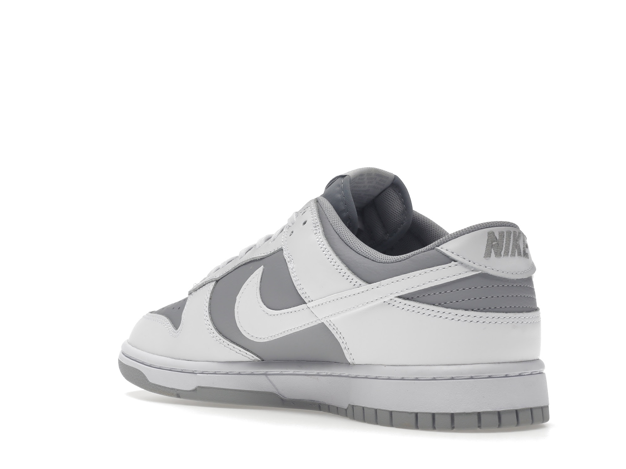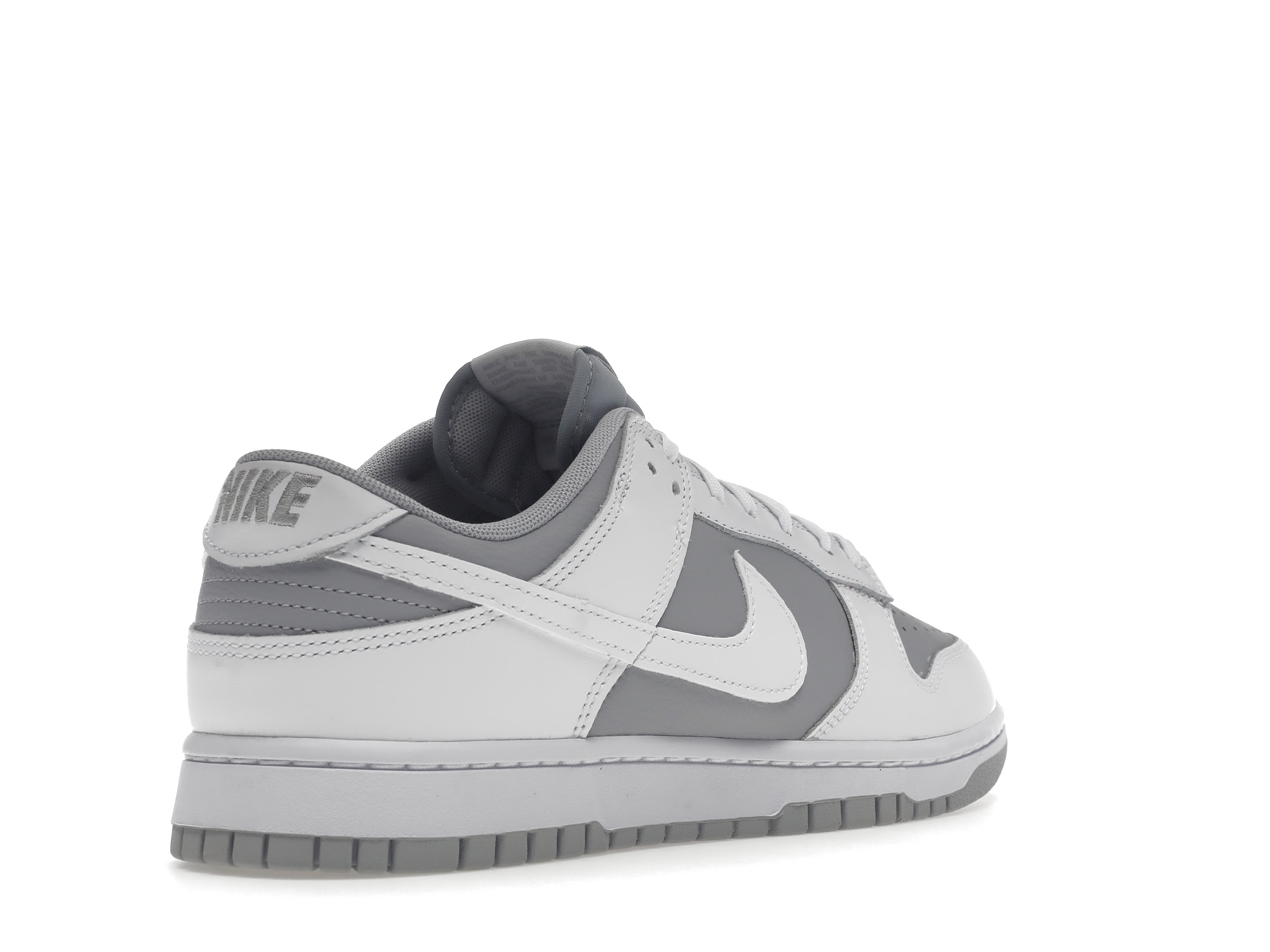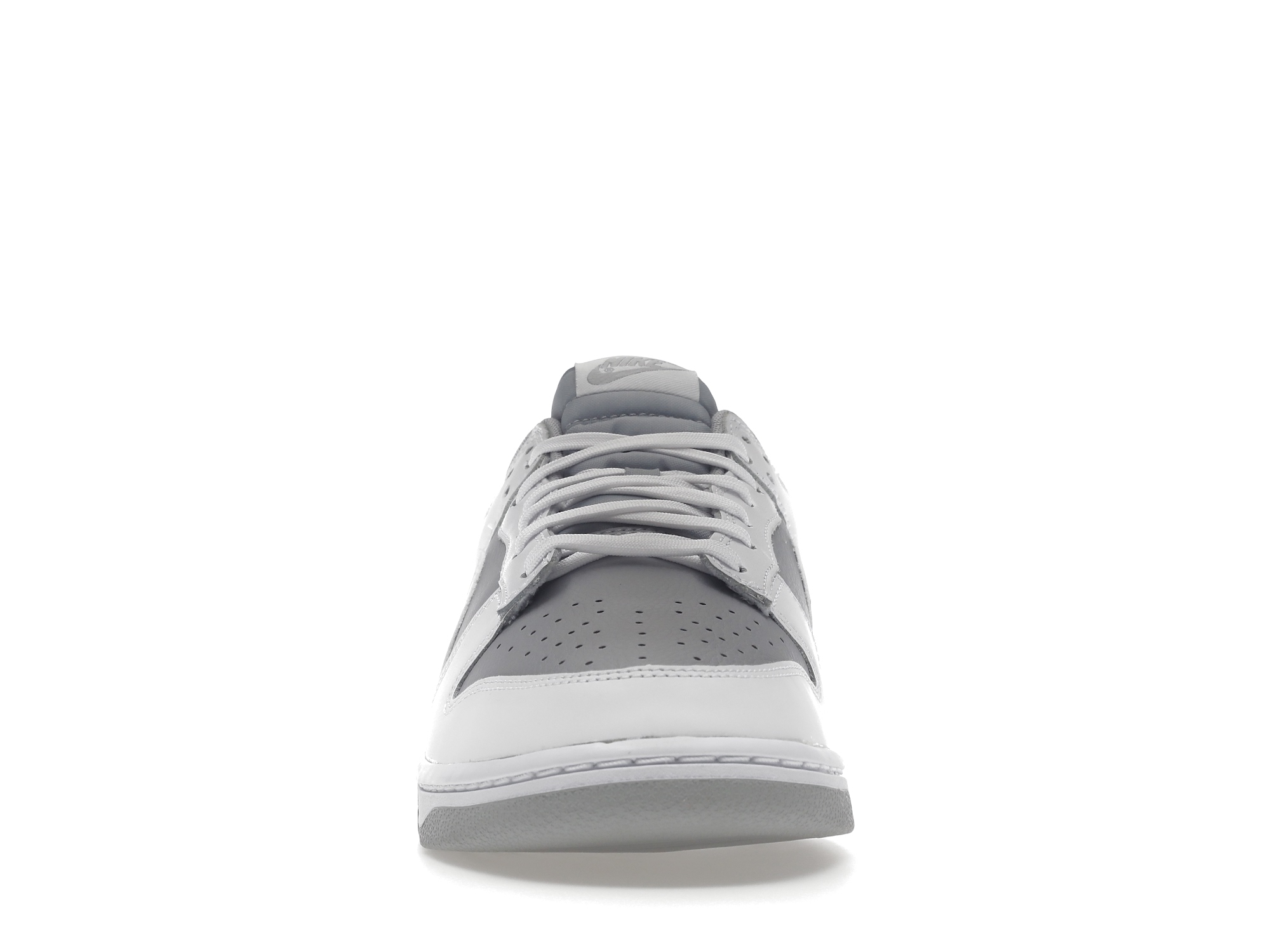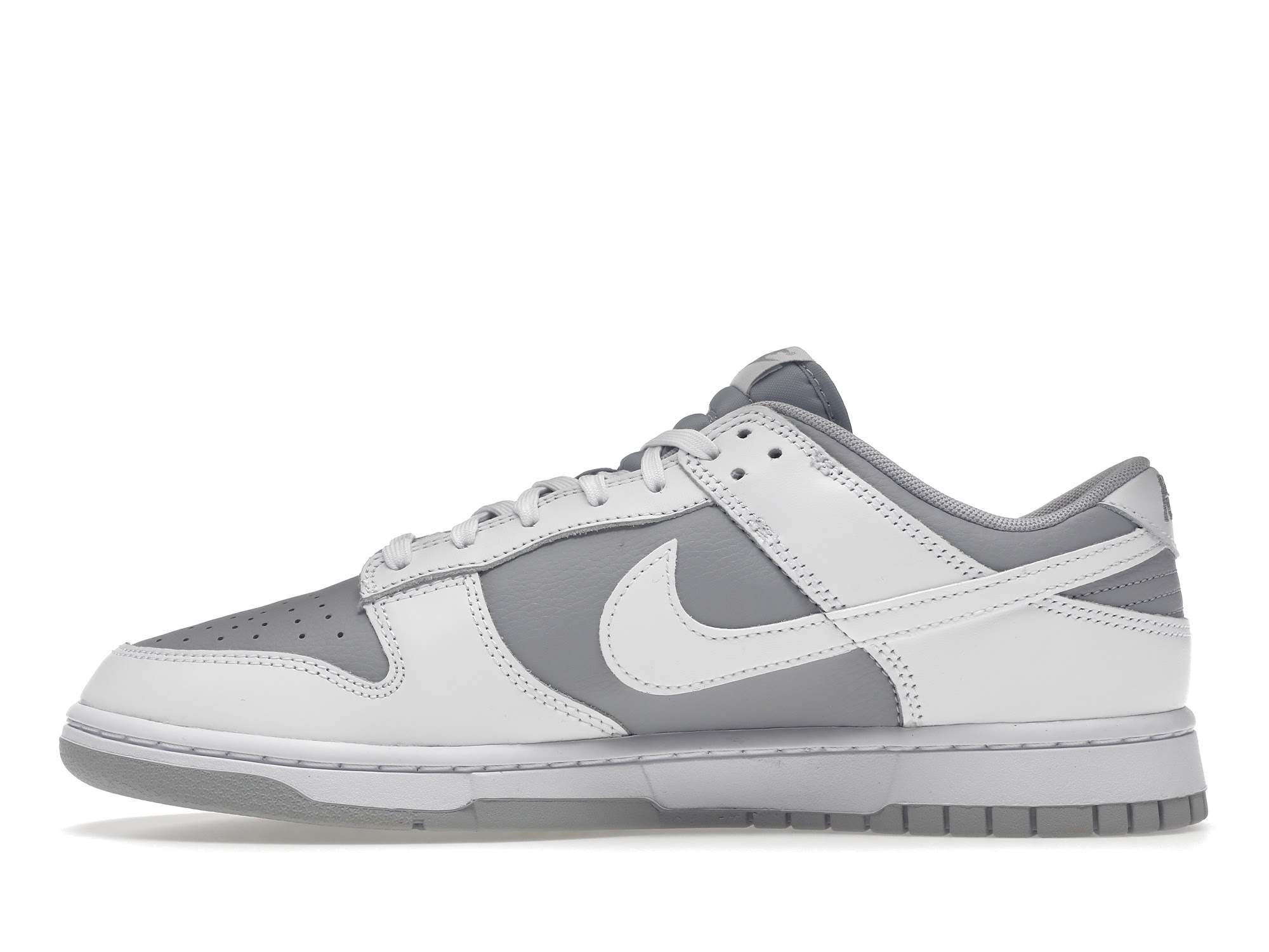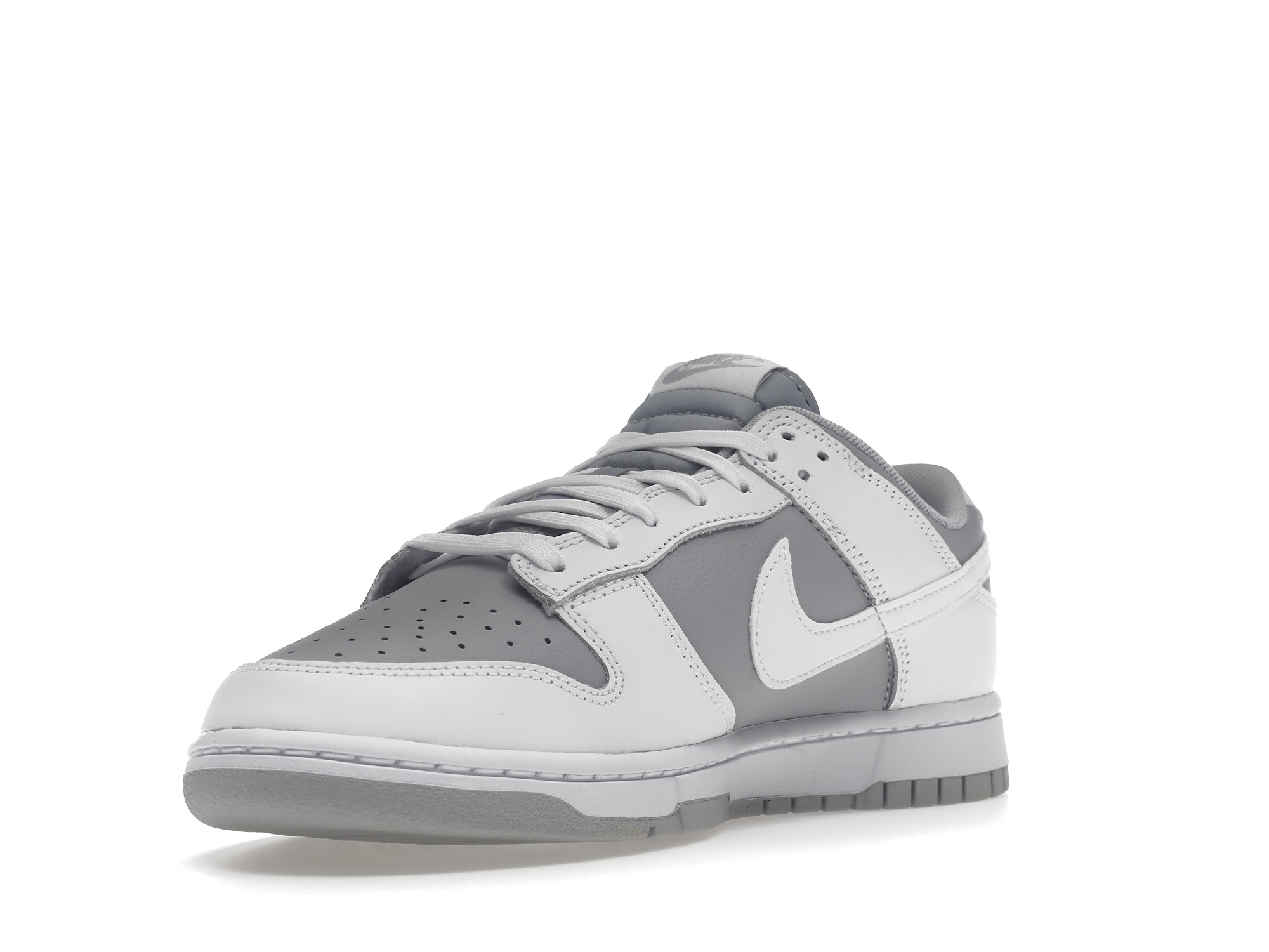 Dressed in a grey and white palette, this shoe features a leather upper with white overlays, laces, Swoosh emblem, and midsole. The grey color is highlighted on the rubber outsole, the woven Nike tongue tag, and the linings. Additional Nike branding can be found on the padded sockliner and heel tab. This Dunk Low rests on a rubber cupsole with the trademark traction pattern.