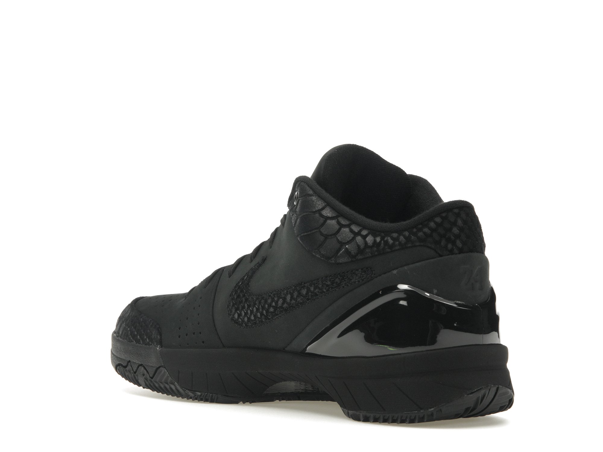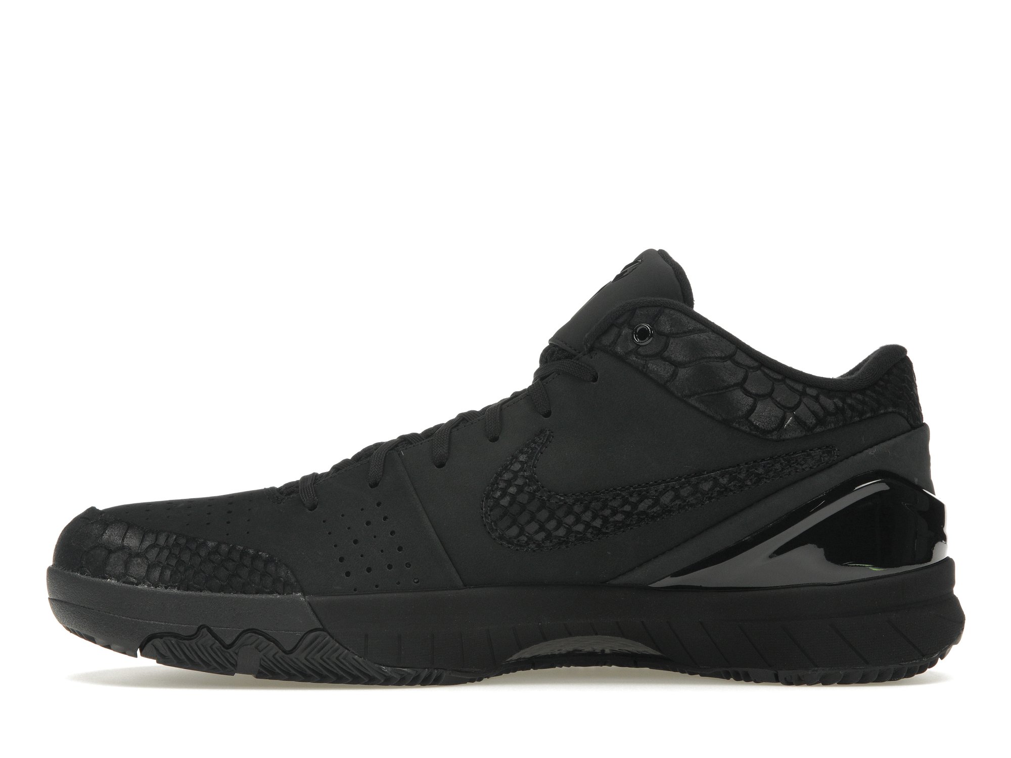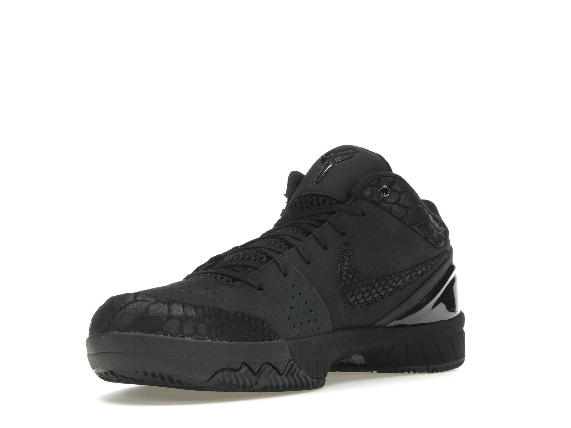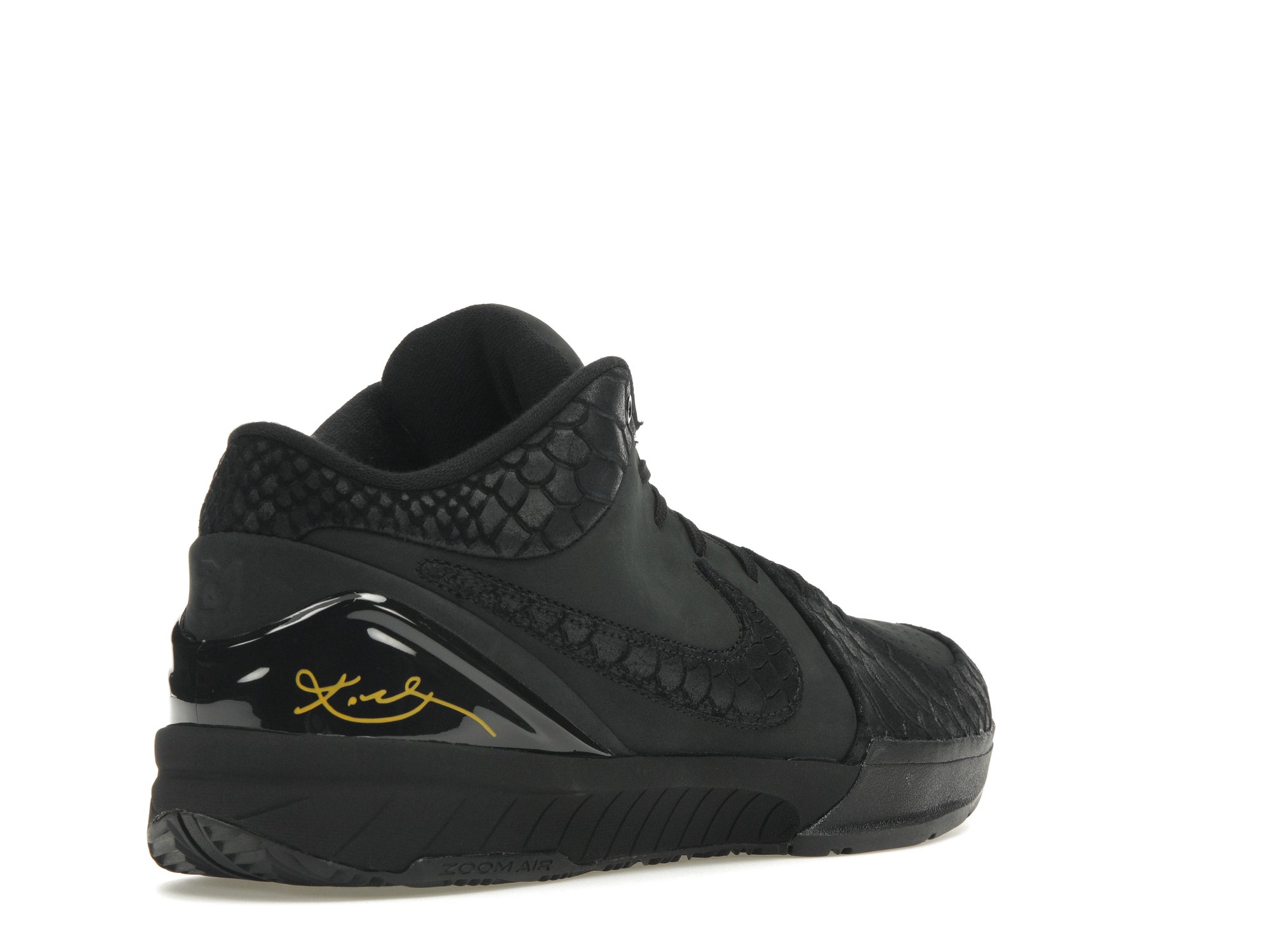 The Nike Kobe 4 Protro Gift of Mamba emerges in a striking Black/Black-University Gold colorway, showcasing a perfect blend of luxury and performance. The upper is crafted from light black suede, complemented by a faux snakeskin pattern on the mudguard, collar, and Swoosh, adding a touch of elegance and edge.